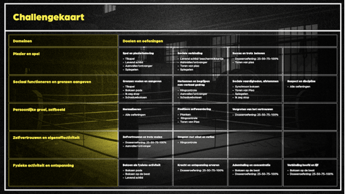 - Challengekaart: een "bingokaart" met oefeningen gekoppeld aan doelen zoals zelfvertrouwen, plezier en spel, sociale interactie, grenzen aangeven en ervaren kracht en ontspanning.